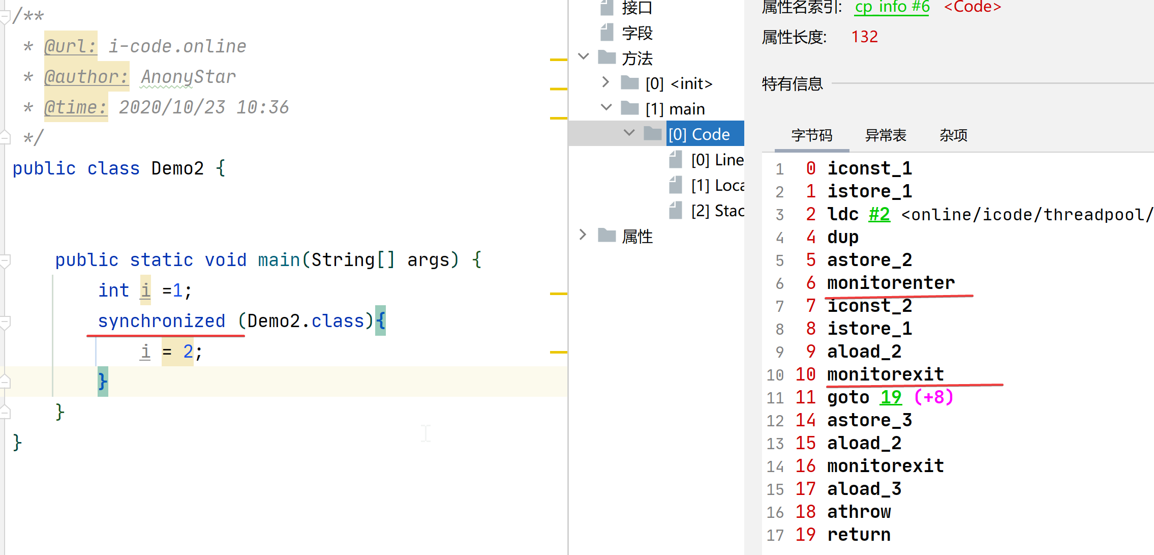 synchronized的代码,我们通过字节码工具可以看到右侧窗口。我们发现,在同步代码块的前后分别形成了monitorenter和monitorexit两条指令 - 在Java对现中都会有一个