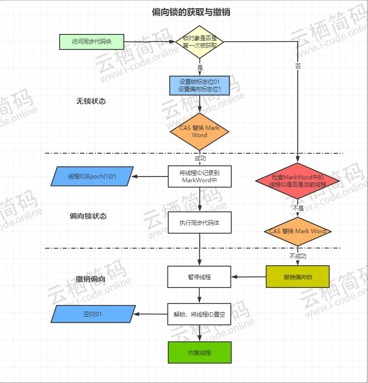 CAS操作来将这个帧的线程ID记录到对象头中,如果CAS成功了。则持有锁对象的线程再之后进入同步代码不再进行任何同步操作(如获取锁解锁等操作)。每次都会通过判断当前线程与锁对象中记录的线程id是否一致。 - 如果 上述的