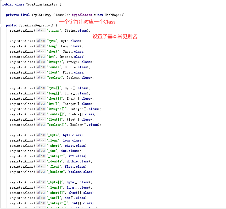 别名也是mybatis中最重要的配置之一,可以通过很简单的一个字符串来代替一个Class,它可以减少很多的重复代码,别名类的源码如下图: