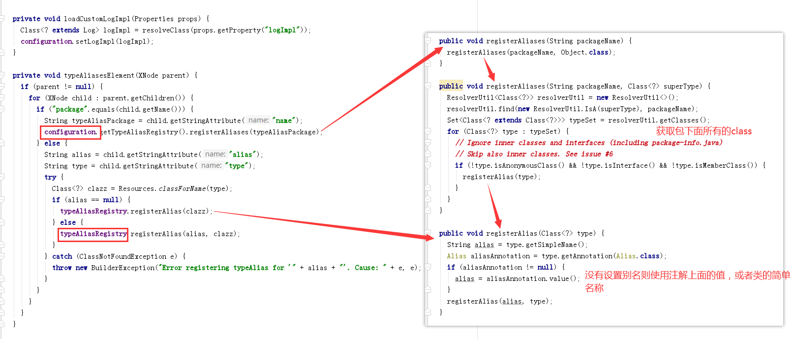 需要注意的是在配置文件中typeAliases支持两种设置一种是package配置一种是简单的typeAliases,package配置的信息被设置到了configuration属性的typeAliasRegistry属性中,而普通配置的是放到当前XMLConfigBuilder对象的typeAliasRegistry属性中,package配置可以把指定包下面的类都加入进来,源码实现如下图:
