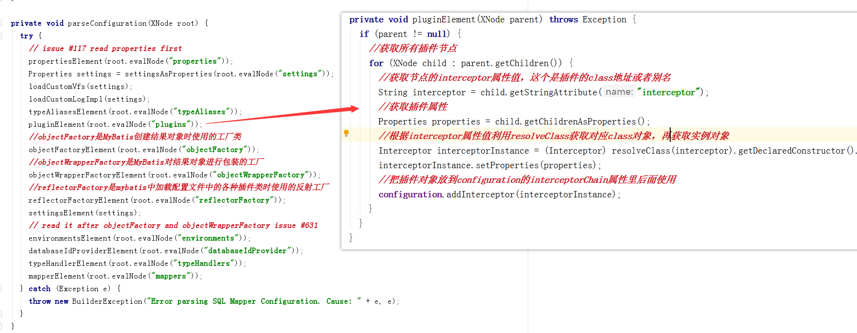 首接下来解析的是插件和创建对象的工厂类配置,源码与注释如下图: