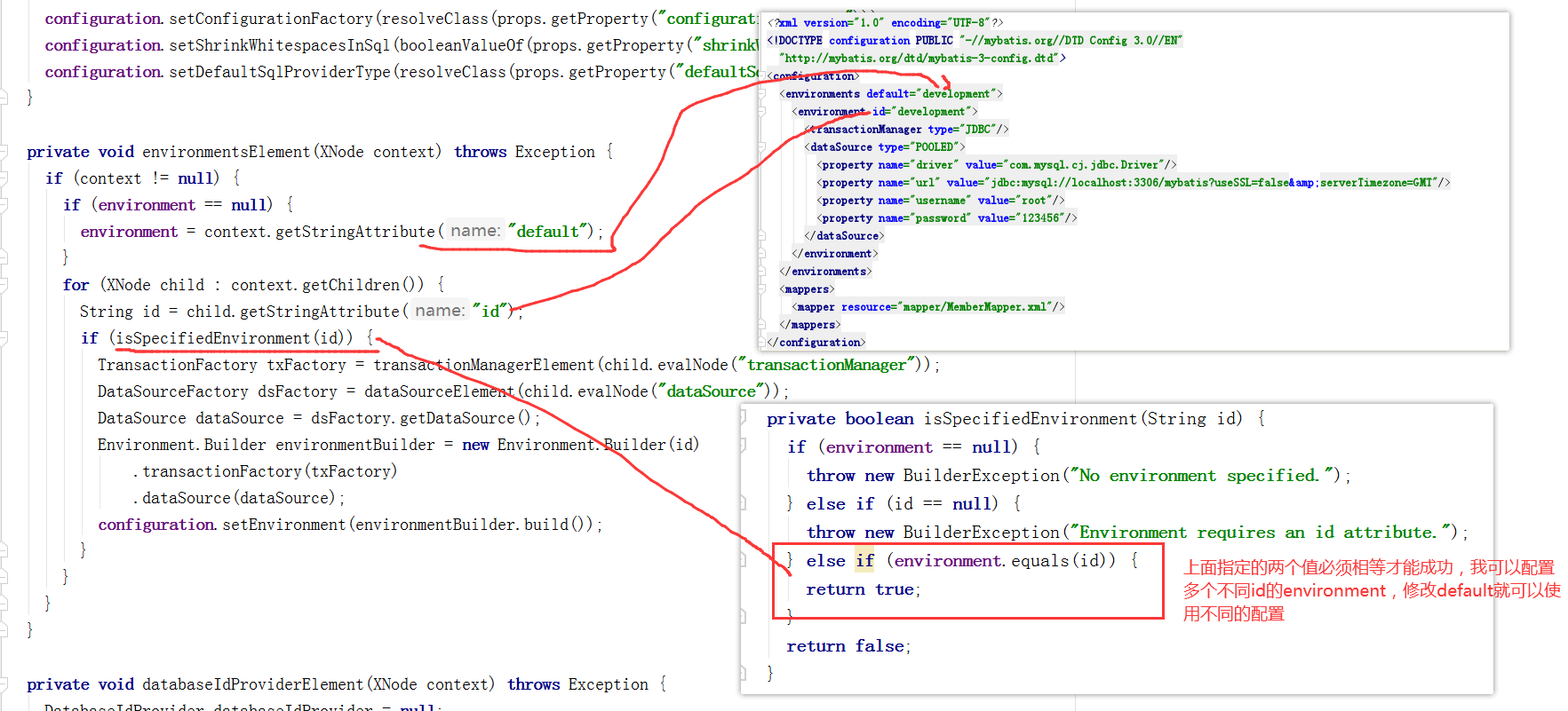 然后是遍历子节点environment,子节点的id必须等于上一步的保存的environment才能加到configuration的environment属性中,所以我们可以在配置文件中设置不同环境environment节点,通过不同的id区分,在environments指定就行;