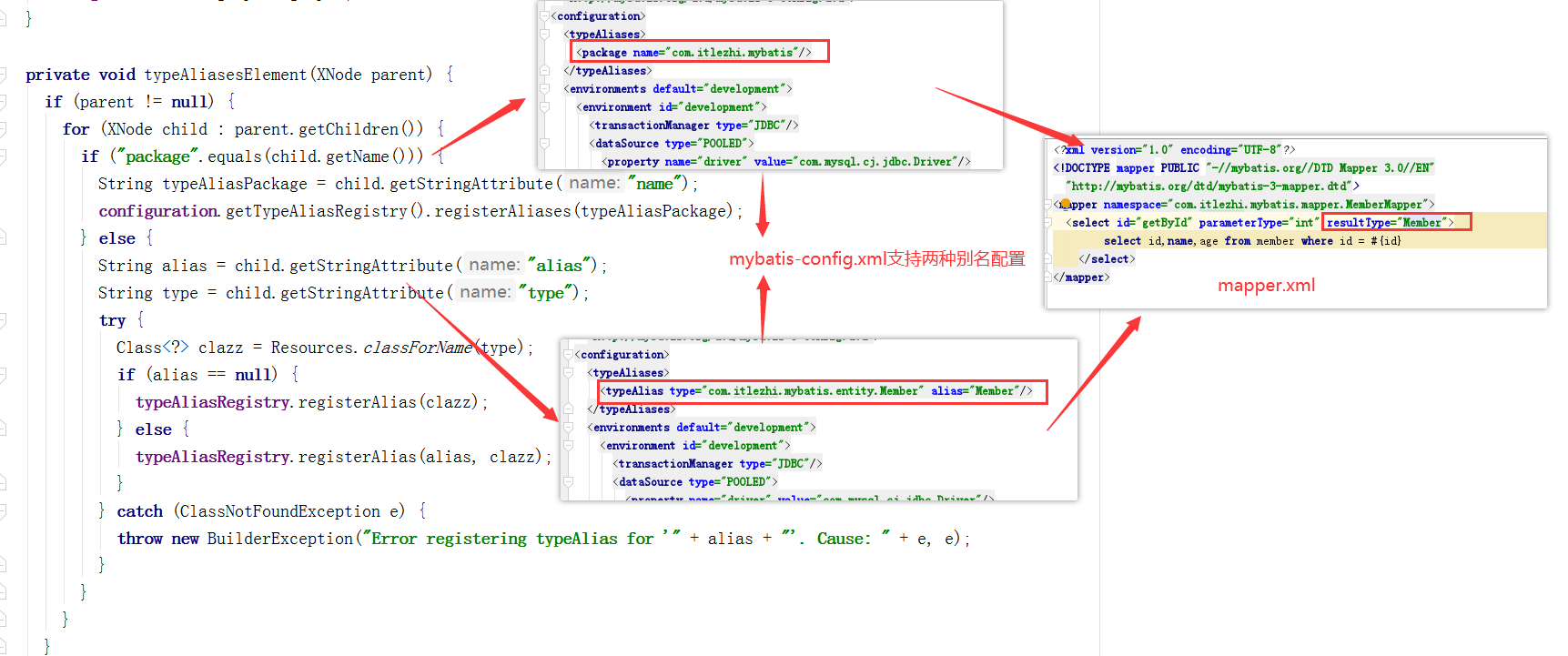 在mybatis的配置文件中也可以设置别名,别名的配置及解析源码如下图: