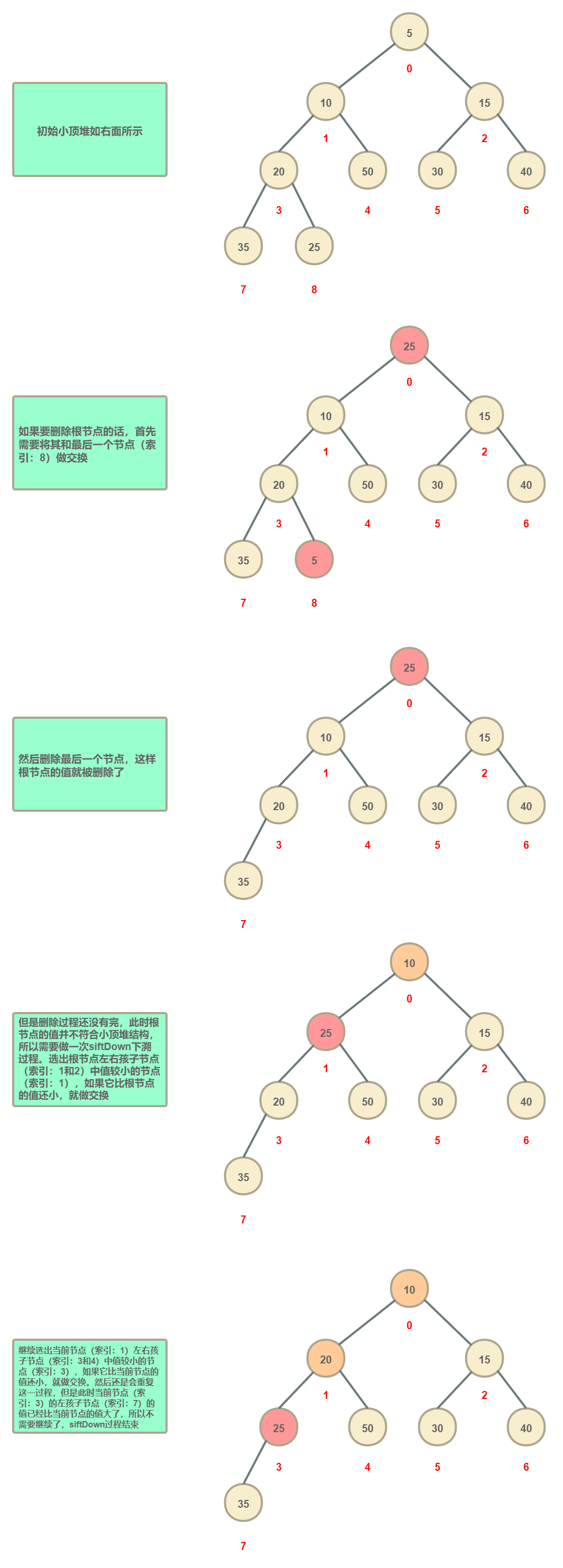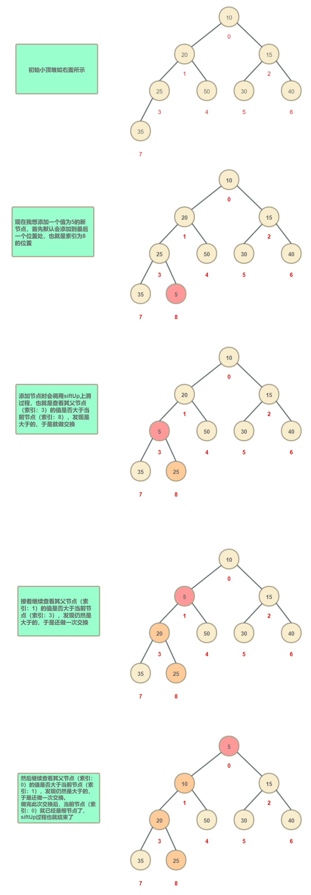 构建堆的两个核心方法是 siftUp和 siftDown,siftUp方法用于添加节点时的上溯过程;而siftDown方法用于删除节点时的下溯过程。具体的实现源码会在下面进行分析,这里就画图来理解一下(下面只会分析经典的小顶堆添加和删除节点的实现,而在源码中的实现略有不同,但核心都是一样的):