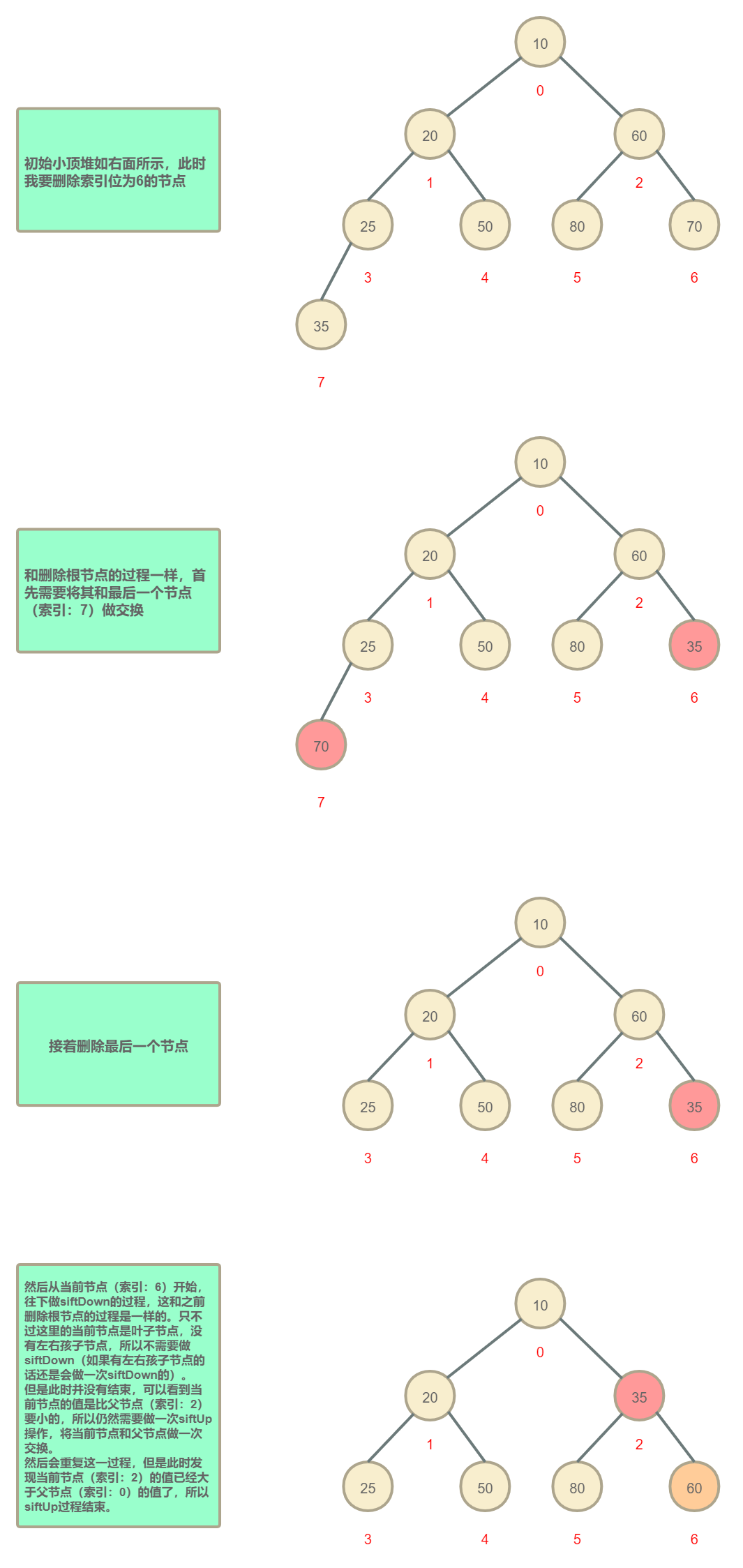 在删除既不是根节点又不是最后一个节点的时候,可以看到执行了一次siftDown并伴随了一次siftUp的过程。但是这个siftUp过程并不是会一定触发的,只有满足最后一个节点的值比要删除节点的父节点的值还要小的时候才会触发siftUp操作(这个很好推理:在小顶堆中如果最后一个节点值比要删除节点的父节点值要小的话,那么要删除节点的左右孩子节点值也必然是都大于最后一个节点值的(不考虑值相等的情况),那么此时就不会发生siftDown操作;而如果发生了siftDown操作,就说明最后一个节点值至少要比要删除节点的左右孩子节点中的一个要大(如果有左右孩子节点的话)。而孙子节点值是肯定要大于爷爷节点值的(不考虑值相等的情况),所以也就是说发生了siftDown操作的时候,最后一个节点值是比要删除节点的父节点值大的。这个时候孙子节点和最后一个节点siftDown交换后,依然是满足小顶堆性质的,所以就不需要附加的siftUp操作;还有一种情况是最后一个节点值是介于要删除节点的父节点值和要删除节点的左右孩子节点值中的较小者,那么这个时候既不会发生siftDown,也不会发生siftUp)。