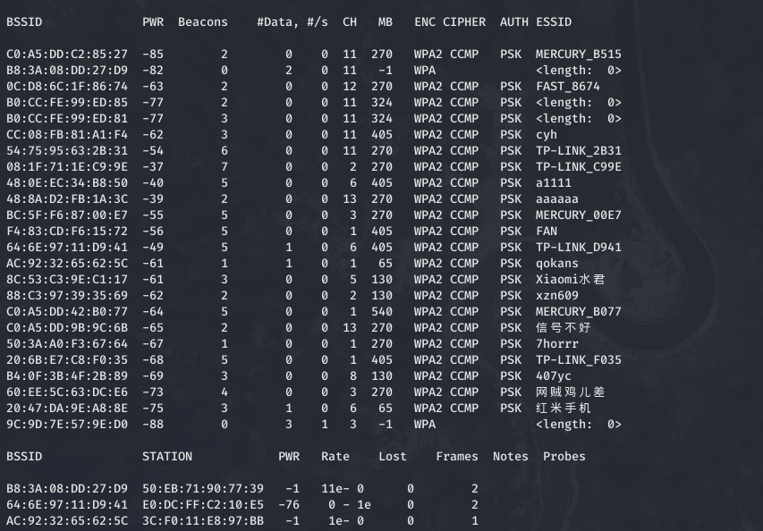 2.扫描周围WPA2-PSK加密的无线信号 airodump-ng wlan0mon