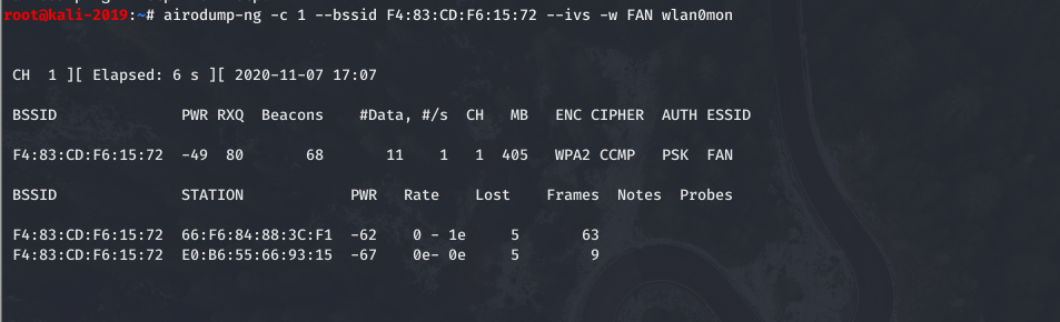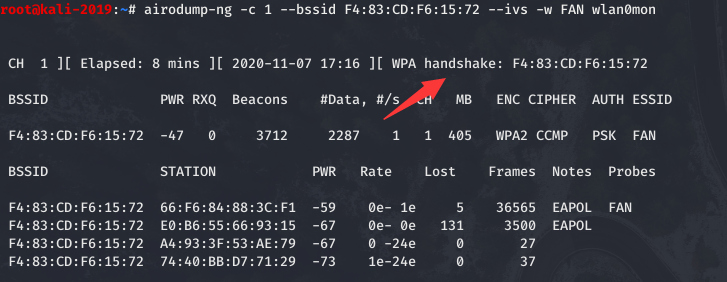 参数:—ivs -w FAN 保存ivs格式的包,名字为test —bssid 要破解ap的ssid