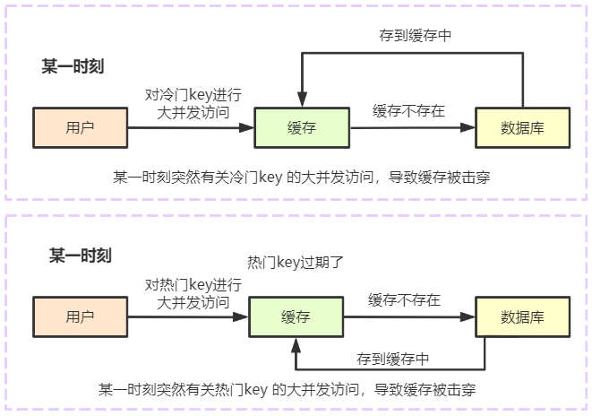 缓存击穿是指有某个key经常被查询,经常被用户特殊关怀,用户非常 love 它 (^▽^),也就类比“熟客” 或者 一个key经常不被访问。但是这时候,如果这个key在缓存的过期时间失效的时候或者这是个冷门key时,这时候突然有大量有关这个key的访问请求,这样会导致大并发请求直接穿透缓存,请求数据库,瞬间对数据库的访问压力增大。
