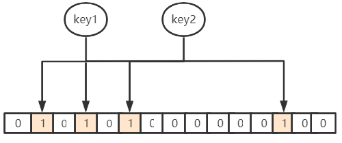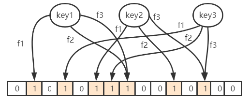 当 key1 和 key2 映射到位数组上的位置为 1 时,假设这时候来了个 key3,要查询是不是在里面,恰好 key3 对应位置也映射到了这之间,那么布隆过滤器会认为它是存在的,这时候就会产生误判(因为明明 key3 是不在的)。