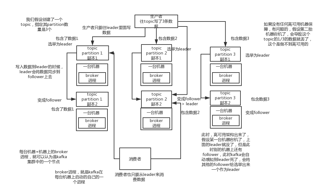 kafka 0.8以后,提供了HA机制,就是replica副本机制。每个partition的数据都会同步到吉他机器上,形成自己的多个replica副本。然后所有replica会选举一个leader出来,那么生产和消费都跟这个leader打交道,然后其他replica就是follower。写的时候,leader会负责把数据同步到所有follower上去,读的时候就直接读leader上数据即可。只能读写leader?很简单,要是你可以随意读写每个follower,那么就要care数据一致性的问题,系统复杂度太高,很容易出问题。kafka会均匀的将一个partition的所有replica分布在不同的机器上,这样才可以提高容错性。