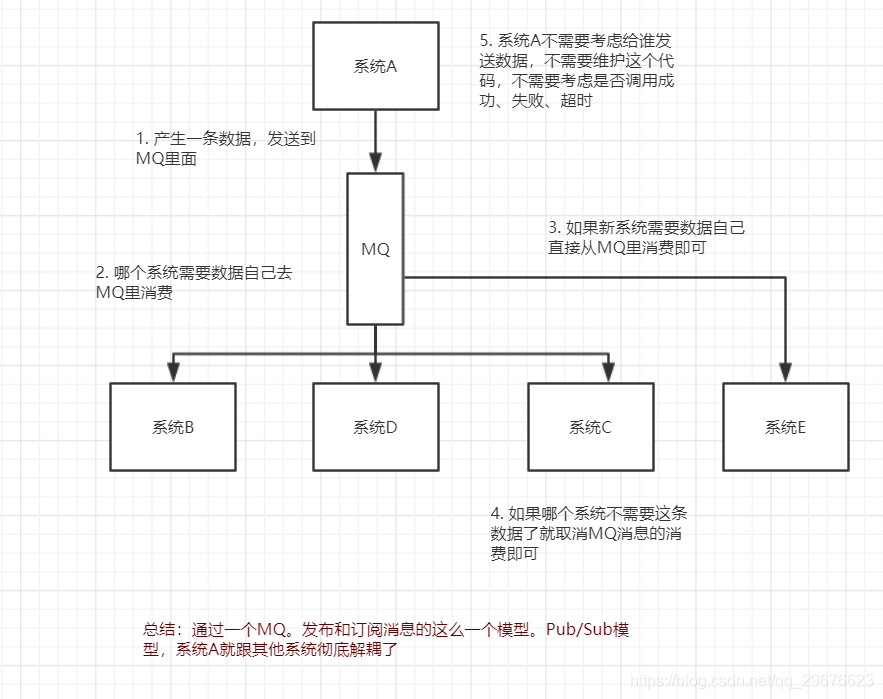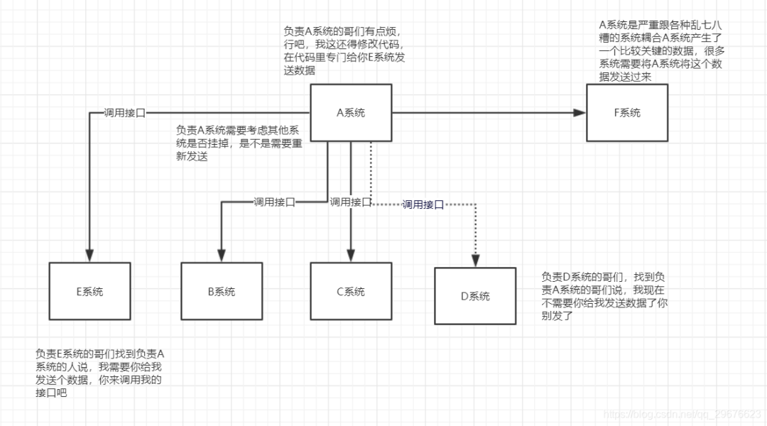 场景描述:A系统发送个数据到BCD三个系统,接口调用发送,那如果E系统也要这个数据呢?那如果C系统现在不需要了呢?现在A系统又要发送第二种数据了呢?A系统负责人崩溃中...再来点崩溃的事儿,A系统要时时刻刻考虑BCDE四个系统如果挂了怎么办?那我要不要重发?我要不要把消息存起来?头发都白了啊...