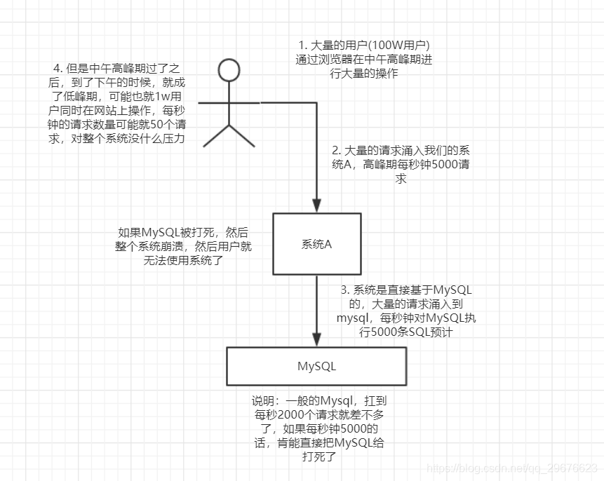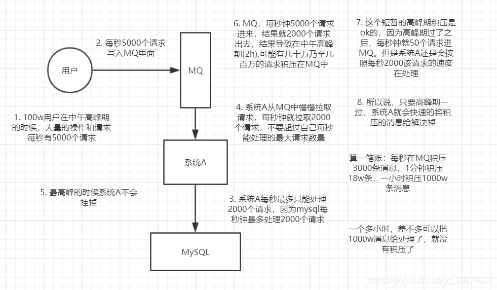 场景描述:每天 0 点到 11 点,系统A风平浪静,每秒并发请求数量就 100 个。结果每一一到11点到1点,每秒并发请求数量就会暴增大1万条 。但是系统最大的处理能力就只能每秒钟处理1000个请求。往期面试题汇总:001期~150期汇总
