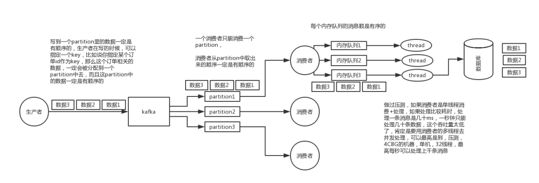 (2)kafka:一个topic,一个partition,一个consumer,内部单线程消费,写N个内存queue,然后N个线程分别消费一个内存queue即可