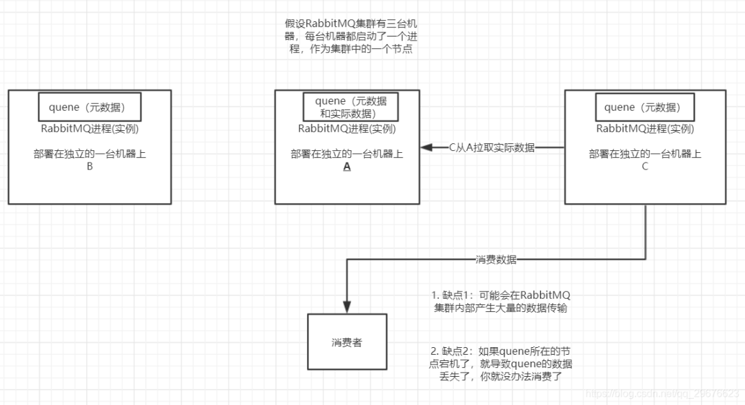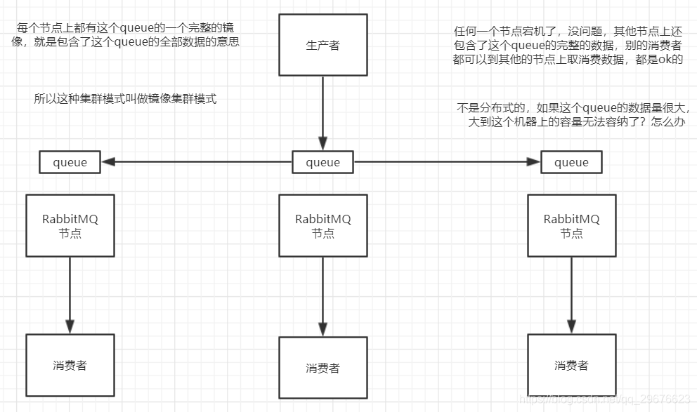 意思就是在多台机器上启动多个rabbitmq实例,每个机器启动一个。但是你创建的queue,只会放在一个rabbtimq实例上,但是每个实例都同步queue的元数据。完了你消费的时候,实际上如果连接到了另外一个实例,那么那个实例会从queue所在实例上拉取数据过来。
