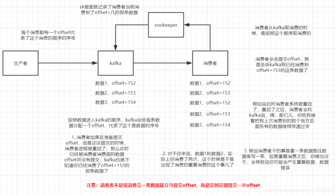 这不是一样么,大家都知道kafka会自动提交offset,那么只要关闭自动提交offset,在处理完之后自己手动提交offset,就可以保证数据不会丢。但是此时确实还是会重复消费,比如你刚处理完,还没提交offset,结果自己挂了,此时肯定会重复消费一次,自己保证幂等性就好了。