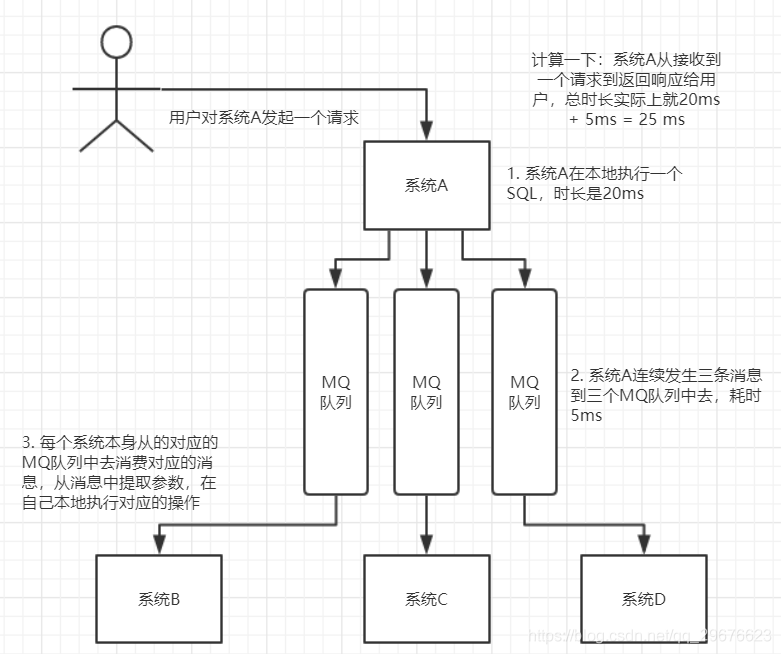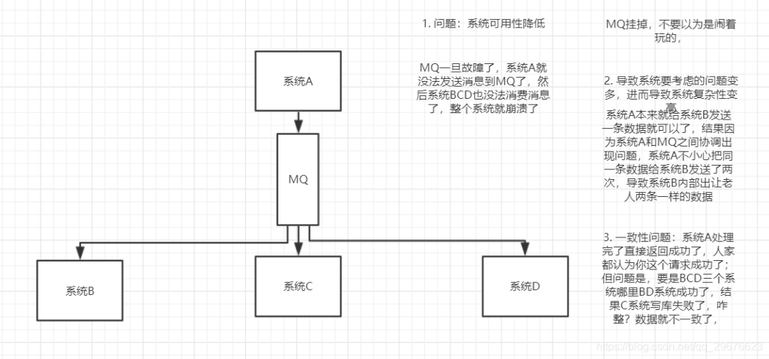 一致性问题:系统A处理完了直接返回成功了,人家都认为你这个请求成功了;但问题是,要是BCD三个系统哪里BD系统成功了,结果C系统写库失败了,咋整?数据就不一致了,