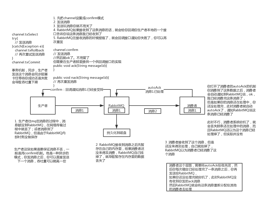 哪怕是你给rabbitmq开启了持久化机制,也有一种可能,就是这个消息写到了rabbitmq中,但是还没来得及持久化到磁盘上,结果不巧,此时rabbitmq挂了,就会导致内存里的一点点数据会丢失。