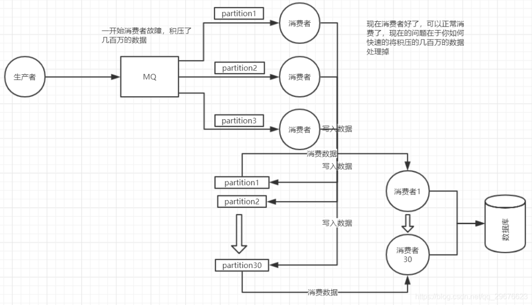 5)这种做法相当于是临时将queue资源和consumer资源扩大10倍,以正常的10倍速度来消费数据