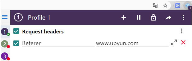 这时使用 ModHeader 扩展程序,有兴趣的小伙伴也可以到 Chrome 商店下载。如图所示配置上 Referer 请求头。