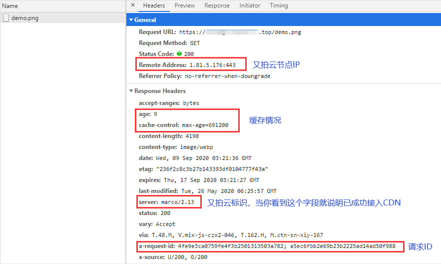 很多小伙伴都会有这样的疑惑,接入 CDN 服务后,如何判别是否成功接入,并且查看节点、缓存等信息。我们可以通过 Chrome 浏览器控制台的 Network 面板查看资源加载情况,同时也可以通过点击任意一个资源查看请求和响应头信息。下图是响应头的基本字段描述,从这些字段中我们可以非常直观的得到节点IP、缓存情况、CDN接入情况等。