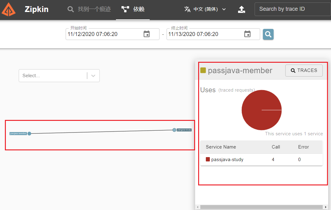 从图中可以看到 passjava-member 微服务调用了 passjava-study 微服务,如图中左半部分所示。