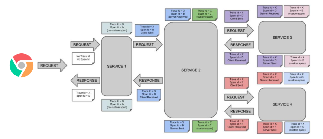 Service 2开始处理这个请求,处理完之后,Trace ID 不变,Span ID = C。 -