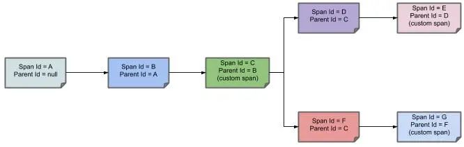 第一个节点:Span ID = A,Parent ID = null, Service 1接收到请求。 -