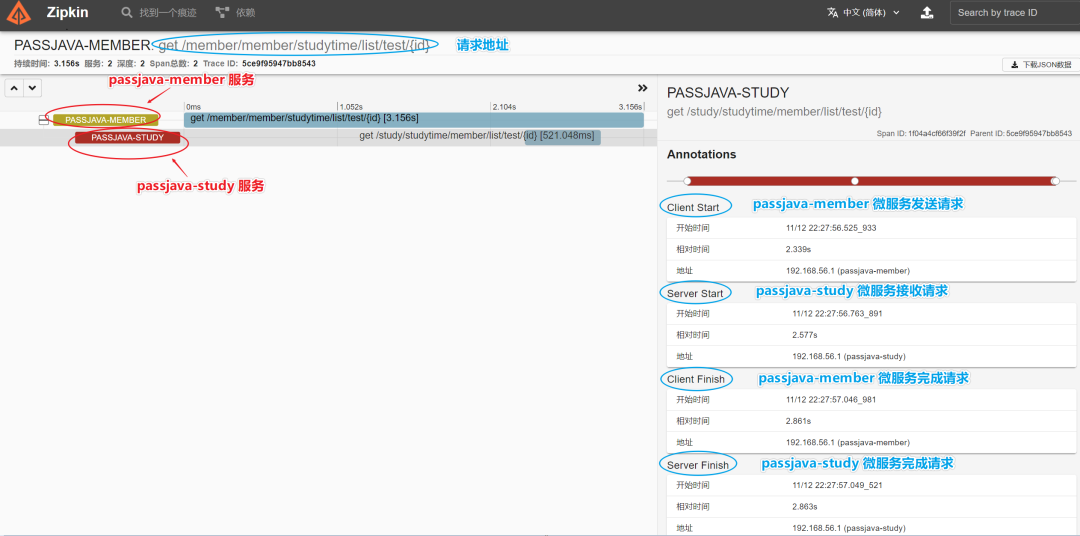打开 Zipkin 工具,搜索 passjava-member 的链路追踪日志,可以看到有一条记录,相关说明如下图所示: