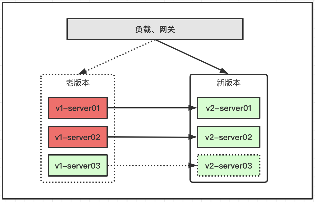 新版本上线的时候,并不停掉老版本,新旧两个版本同时运行,通常还会在负载均衡的策略上倾向于旧版本服务处理请求,这样新版本就有一个执行的观察期过渡期,等到新版本平稳运行一段时间后,再把请求都发到新版服务上,旧版本服务完成下线。这种方式在分布式架构下很少使用,对服务器要求过高。