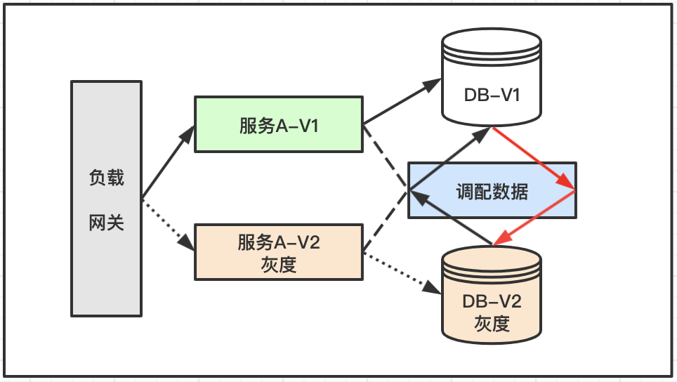 该模式中,除了正常的灰度流程之外,需要在灰度数据库和正常数据中间提供一个数据调配服务,用来解决如下问题:灰度数据库缺失数据,需要临时从正常库拉取,灰度版本失败,新数据需要重新整合写入原本正常库;灰度版本成功,旧版数据迁移等;最终保证数据的平稳升级。