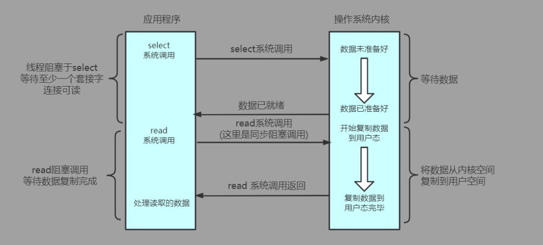举个例子:当线程通过基于BIO的系统调用进行磁盘读取时,内核会令当前线程进入阻塞态,让出CPU资源给其它并发的就绪态线程,以便更有效率的利用CPU。当DMA完成读取,异步的I/O中断到来时,内核会找到先前被阻塞的对应线程,将其唤醒进入就绪态。当这个就绪态的线程被内核CPU调度器选中再度获得CPU时,便能从对应的缓冲区结构中得到读取到的磁盘数据,程序同步的执行流便能顺利的向下执行了。(感觉好像线程卡在了那里不动,过了一会才执行下一行,且指定的缓冲区中已经有了所需的数据)