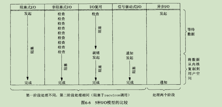 ' 操作系统内核提供的I/O模型大致可以分为几种:同步阻塞I/O、同步非阻塞I/O、同步I/O多路复用、异步非阻塞I/O(信号驱动I/O用的比较少,就不在这里展开了)。