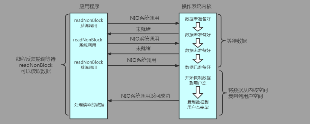 针对BIO模型的缺陷,NIO模型的系统调用不会阻塞当前调用线程。但由于I/O本质上的耗时特性,无法立即得到I/O处理的结果,NIO的系统调用在I/O未完成时会返回特定标识,代表对应的I/O事件还未完成。因此需要应用程序按照一定的频率反复调用,以获取最新的IO状态。