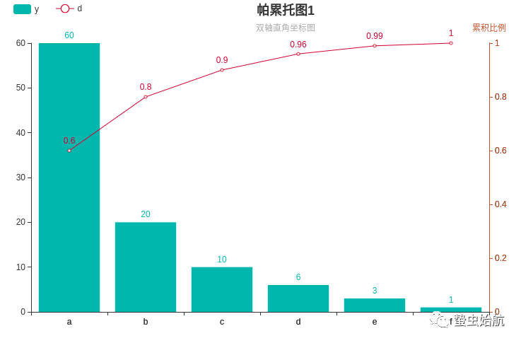 bar=pyecharts.charts.Bar()bar.add_xaxis(list('abcdef'))bar.add_yaxis('y',a,color='#1eafae')bar.set_global_opts(title_opts=opts.TitleOpts(title="帕累托图1", subtitle="双轴直角坐标图",pos_left='center'),legend_opts=opts.LegendOpts(pos_left='60px'))line=pyecharts.charts.Line()line.add_xaxis(list('abcdef'))line.add_yaxis('d',b,z_level=2)line.extend_axis(yaxis=opts.AxisOpts(name="累积比例",type_="value",min_=0,max_=1,position="right",axisline_opts=opts.AxisLineOpts(linestyle_opts=opts.LineStyleOpts(color="#ba5c25"))))line.set_global_opts(yaxis_opts=opts.AxisOpts(position="right"),legend_opts=opts.LegendOpts(pos_left='120px'))grid=pyecharts.charts.Grid()grid.add(bar,grid_opts=opts.GridOpts(pos_right="18%"))grid.add(line,grid_opts=opts.GridOpts(pos_right="18%"))grid.render_notebook()