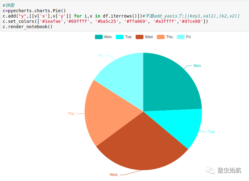 c=pyecharts.charts.Pie() #pyecharts绘制饼图c.add("y",[[v['x'],v['y']] for i,v in df.iterrows()])#不是add_yaxis了;[(key1,val1),(k2,v2)]c.set_colors(['#1eafae','#69ffff', '#ba5c25', '#ffa069', '#a3ffff','#d7ce88'])c.render_notebook()