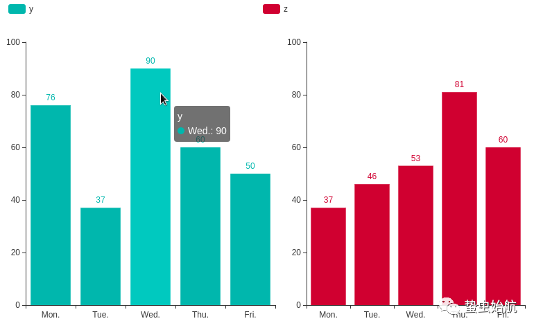 #在同一坐标系里叠加多种图bar=pyecharts.charts.Bar()bar.add_xaxis(list(df['x']))bar.add_yaxis("y",list(df['y']),color='#1eafae')line = pyecharts.charts.Line().add_xaxis(list(df['x'])) \.add_yaxis("z",list(df['z']),color='#ba5c25',z_level=2)bar.overlap(line)bar.render_notebook()