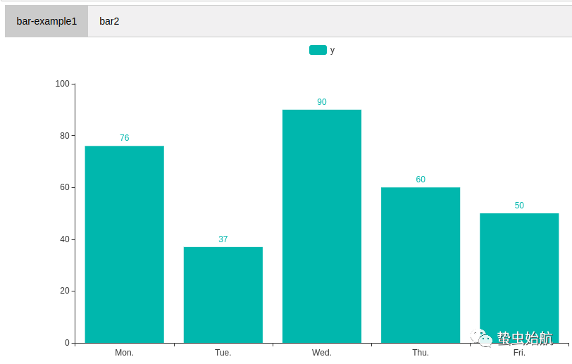 tab = pyecharts.charts.Tab()bar1=pyecharts.charts.Bar()bar1.add_xaxis(list(df['x']))bar1.add_yaxis('y',list(df['y']),color='#1eafae')bar2=pyecharts.charts.Bar()bar2.add_xaxis(list(df['x']))bar2.add_yaxis('z',list(df['z']),color='#ba5c25')tab.add(bar1, "bar-example1")tab.add(bar2, "bar2")tab.render_notebook()