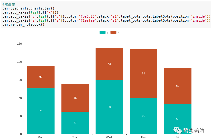 #堆叠柱df=pd.DataFrame({'x':['Mon.','Tue.','Wed.','Thu.','Fri.'],'y':[76,37,90,60,50],'z':[37,46,53,81,60]})bar=pyecharts.charts.Bar()bar.add_xaxis(list(df['x']))bar.add_yaxis("y",list(df['y']),color='#ba5c25',stack='s1',label_opts=opts.LabelOpts(position='inside'))bar.add_yaxis("z",list(df['z']),color='#1eafae',stack='s1',label_opts=opts.LabelOpts(position='inside'))bar.render_notebook()