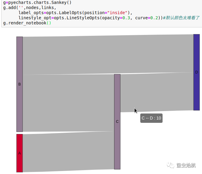 nodes = [{"name": "A", "symbolSize": 10},{"name": "B", "symbolSize": 40},{"name": "C", "symbolSize": 20},{"name": "D", "symbolSize": 10}]links=[{"source":'A', "target":'C','value': 10},{"source":'B', "target":'C','value': 15},{"source":'C', "target":'D','value': 10},{"source":'B', "target":'D','value': 10},]g=pyecharts.charts.Sankey()g.add('',nodes,links,label_opts=opts.LabelOpts(position="inside"),linestyle_opt=opts.LineStyleOpts(opacity=0.3, curve=0.2)) #默认颜色太难看了g.render_notebook()