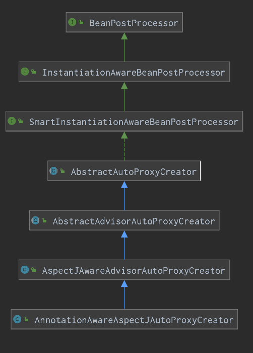 其中AspectJAutoProxyRegistrar实现了ImportBeanDefinitionRegistrar,所以在处理BeanFactoryPostProcessor逻辑时将会调用registerBeanDefinitions方法,此时就会把AnnotationAwareAspectJAutoProxyCreator注册到容器中,其中BeanFactoryPostProcessor的逻辑就不再说了,往期文章有过详细分析。而AnnotationAwareAspectJAutoProxyCreator的类图如下: