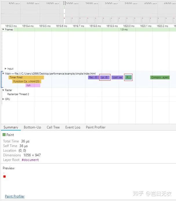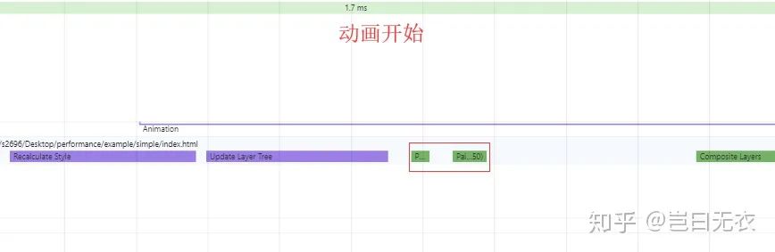 我们将使用 transform 来向下位移,开始我们先不把 div 节点提升为 Composited Layer;通过下图可以看到:还是会触发 Layout 和 Paint 的。
