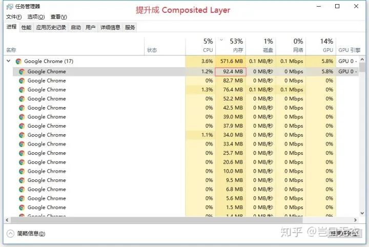 提升成 Composited Layer 的确会优化性能;但是,要知道创建一个新的 Composited Layer 必须要额外的内存和管理,这是非常昂贵的代价。所以,在内存资源有限的设备上,Composited Layer 带来的性能提升,很可能远远抵不上创建多个 Composited Layer 的代价。同时,由于每一个 Composited Layer 的位图都需要上传到 GPU;所以,不免需要考虑 CPU 和 GPU 之间的带宽以及用多大内存处理 GPU 纹理的问题。