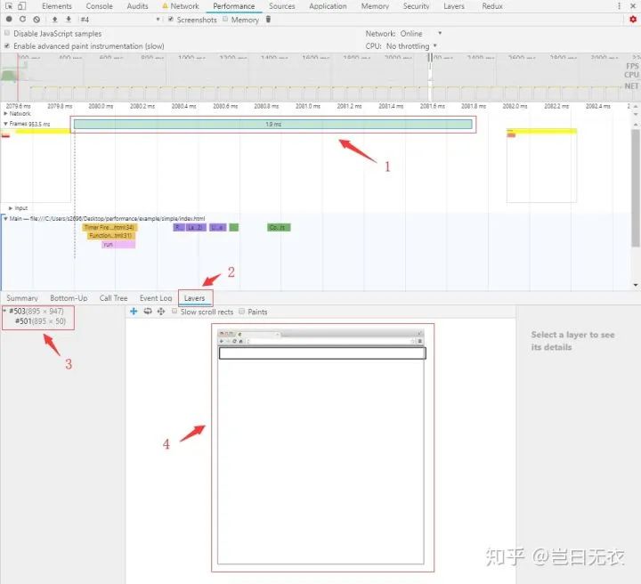 并且,我们也可以通过一帧(标记 1)的布局详情(标记 2),查看固定区域(标记 3)是不是提升成 Composited Layer(标记 4),才避免的不必要绘制。