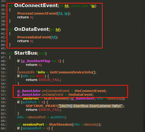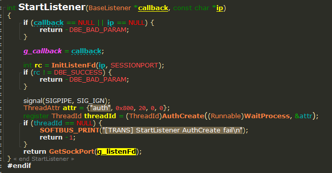 trans_service模块的使用者设置的回调函数将在存在新连接、和新数据时被调用,比如认证模块通过以下函数完成认证动作:OnConnectEvent()函数中完成对新连接的处理, OnDataEvent()函数中完成对新数据的处理。