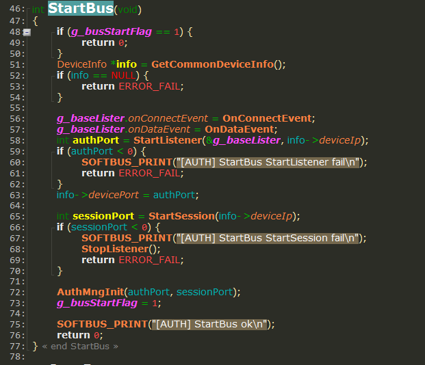 authmanager模块中存在StartBus()函数,其中,StartListener()函数负责为认证模块提供通道完成初始化,StartSession()函数负责初始化业务的session管理:
