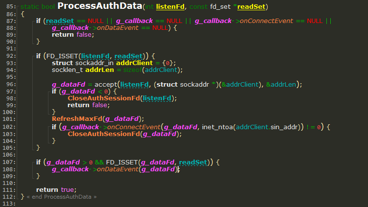 函数通过FD_ISSET()判断是否是listenFd上存在消息,如果是,则说明当前存在新的连接,这时调用accept()完成链接创建,新创建的socket的fd被存储在g_dataFd中,同时调用g_callback->onConnectEvent通知认证模块有新的连接事件发生,并将新创建的fd和client的IP地址告知认证模块。