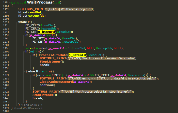 WaitProcess()使用忙等方式,调用select()来监听listenFd和数据g_dataFd的信息,如果监听到有数据可读,则进入ProcessAuthData来处理。