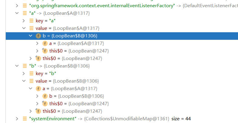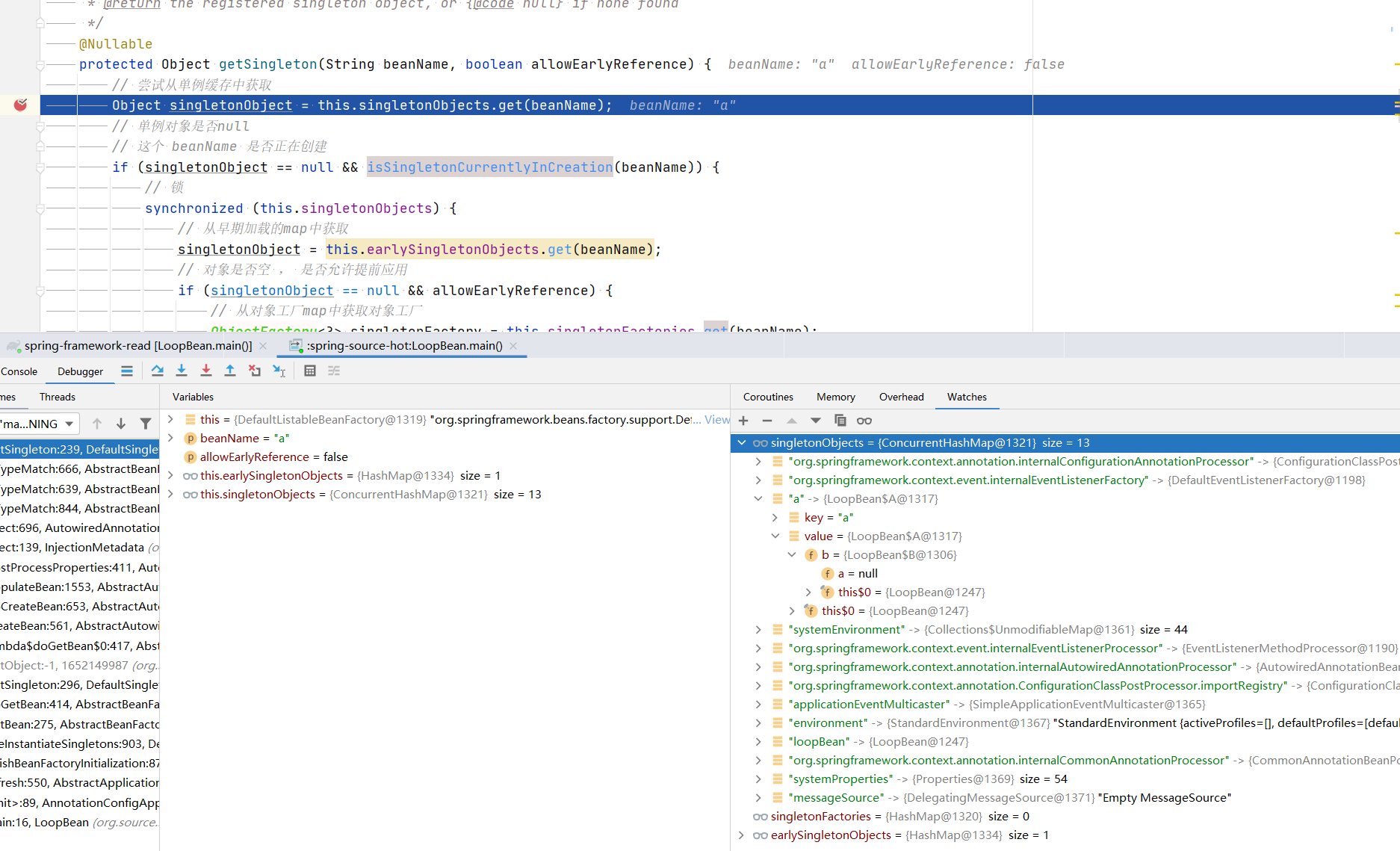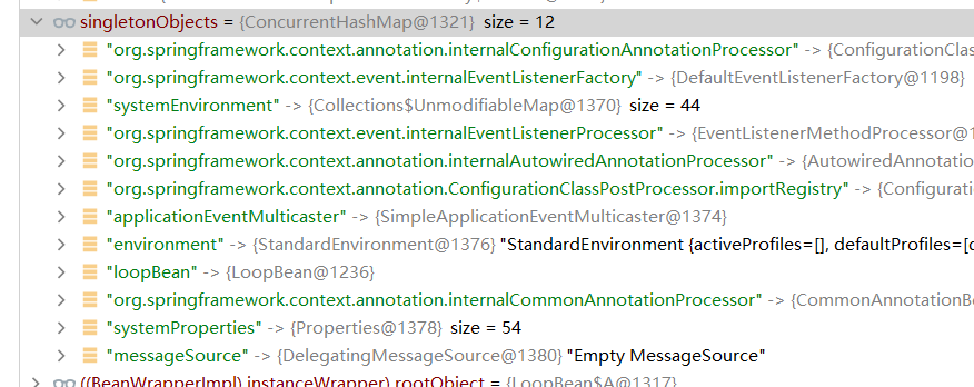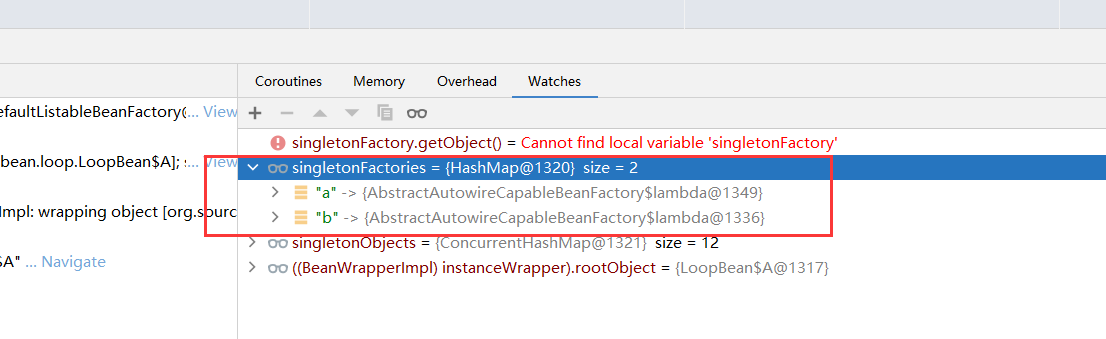 从上面两个截图可以知道单例对象的容器中还没有 a b 两个实例. 他们还在 ObjectFactory 容器中等待被使用