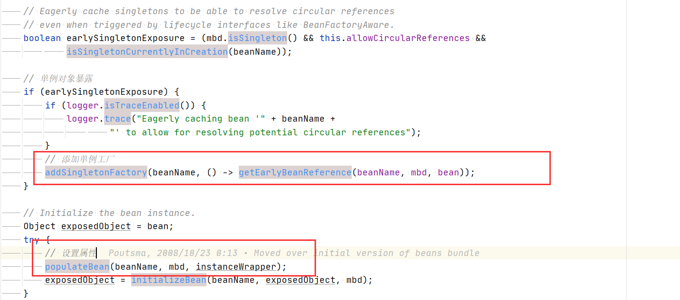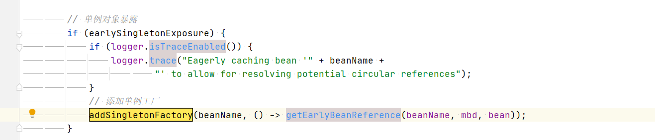 加入 ObjectFactory 容器的方法: addSingletonFactory(beanName, () -> getEarlyBeanReference(beanName, mbd, bean));