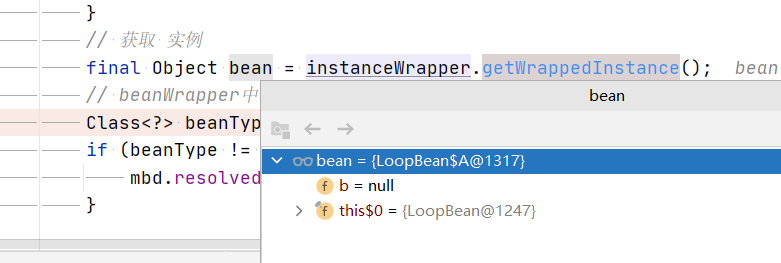 这个状态就是创建bean实例状态. 继续往下走会有设置属性的代码